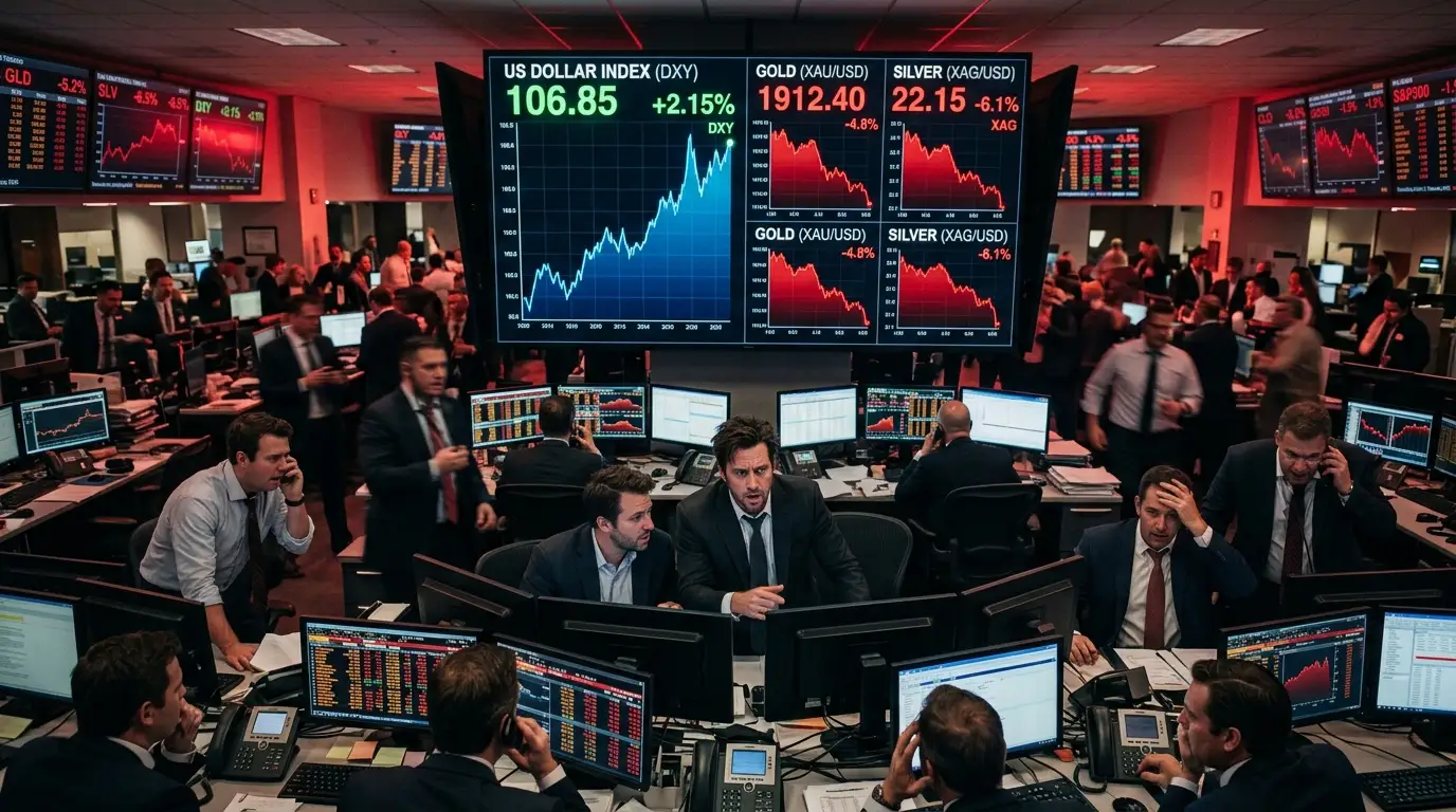 Indeks američkog dolara probio je nivo od 100 i dostigao tromesečni maksimum, što je bio glavni okidač pada plemenitih metala. Iza dolarove snage stoji nekoliko faktora koji su se toga dana poklopili: rastuće cene nafte usled napetosti između SAD i Irana i pretnji zatvaranjem Hormuškog moreuza paradoksalno jačaju dolar, budući da su Sjedinjene Države neto izvoznik energije, dok uvoznici energije poput Evrope i Japana trpe. Uz to, tržišta su repricirala očekivanja o smanjenju kamatnih stopa, a svop tržišta su na kraju dana pokazivala svega 2% verovatnoće za rez na zasedanju Feda 17-18. marta.